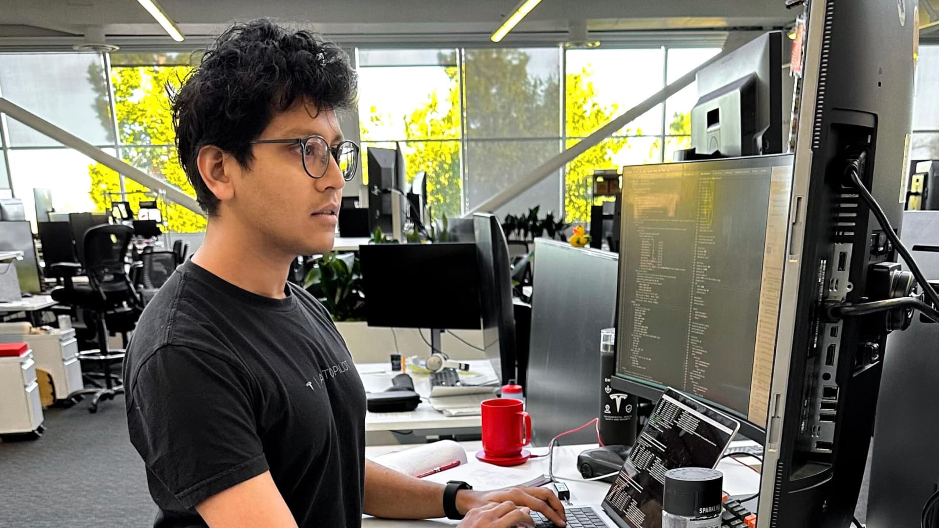 Dhaval Shroff works at his desk at Tesla.